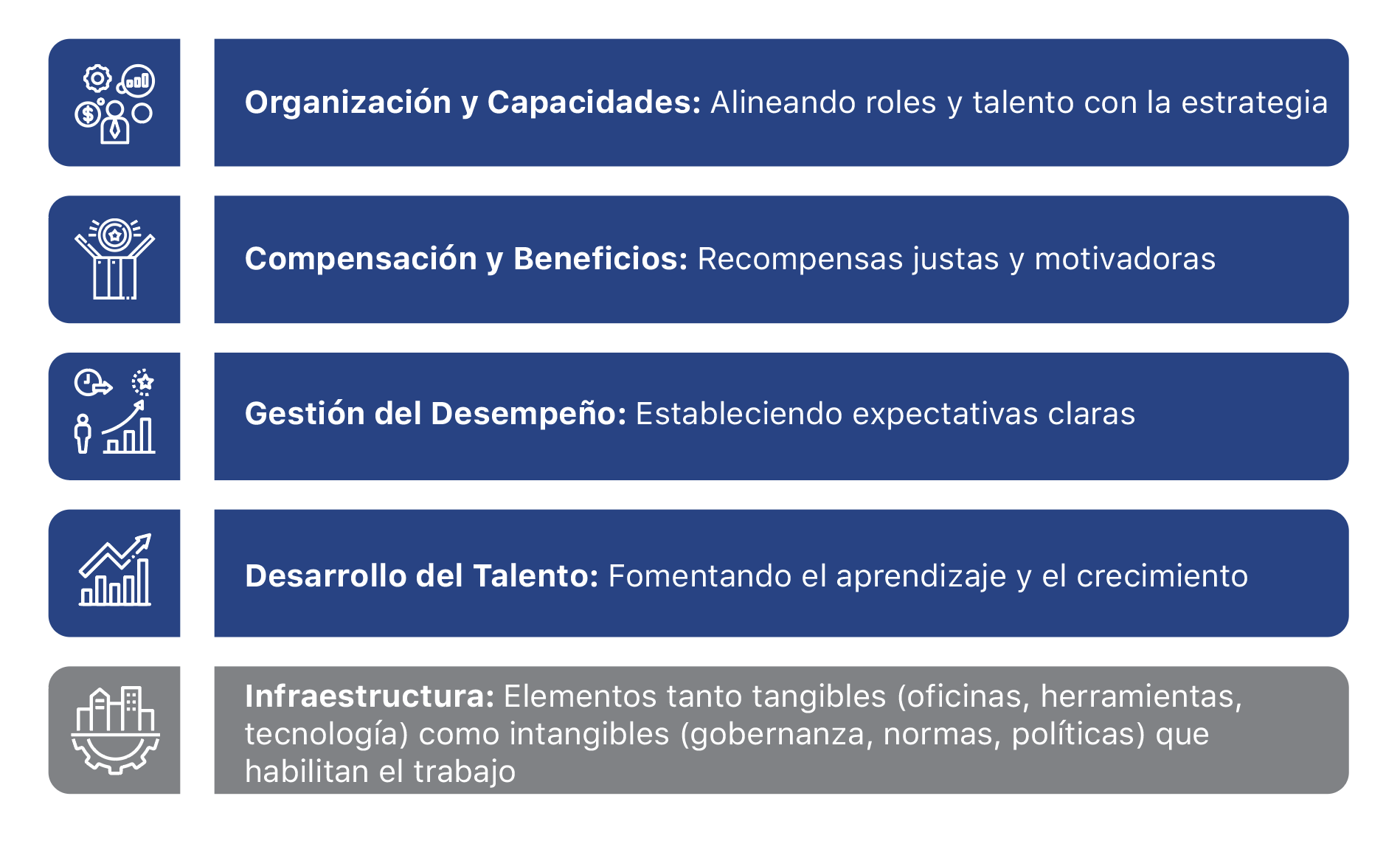 - Organización y Capacidad: alineación de roles y talento con la estrategia