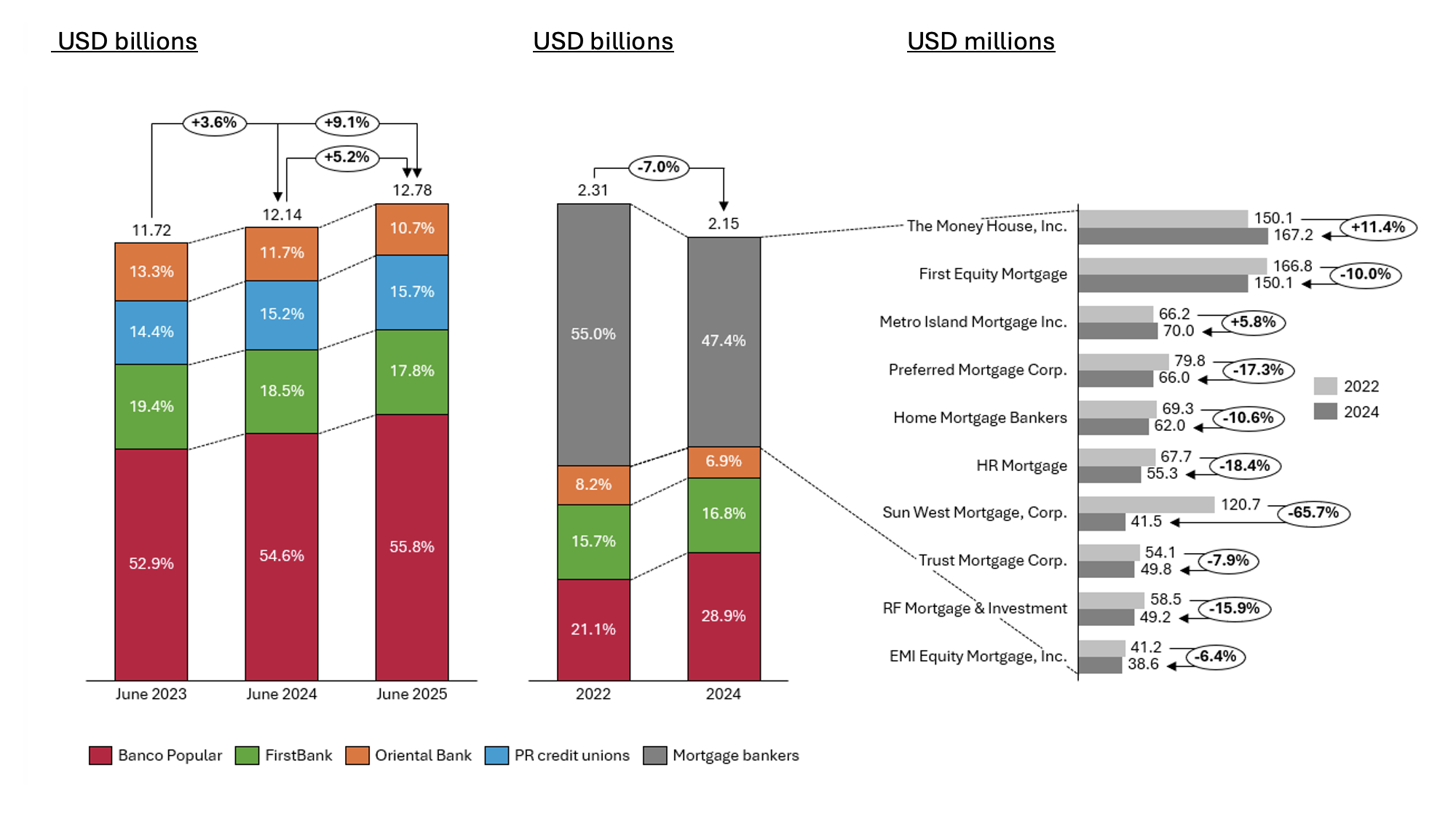 With respect to mortgage loan originations, there was been a notable shift in the mix between banks and mortgage companies. Mortgage companies saw their market share decline by eight percentage points between 2022 and 2024 (from 55.0% to 47.4%), partially reversing the gains achieved during the 2018–2022 period, when their share increased from 42.5% to 55.0% (see V2A’s Q4 2023 Banking Industry Report). FirstBank—and particularly Banco Popular—gained mortgage origination market share during the 2022–2024 period.